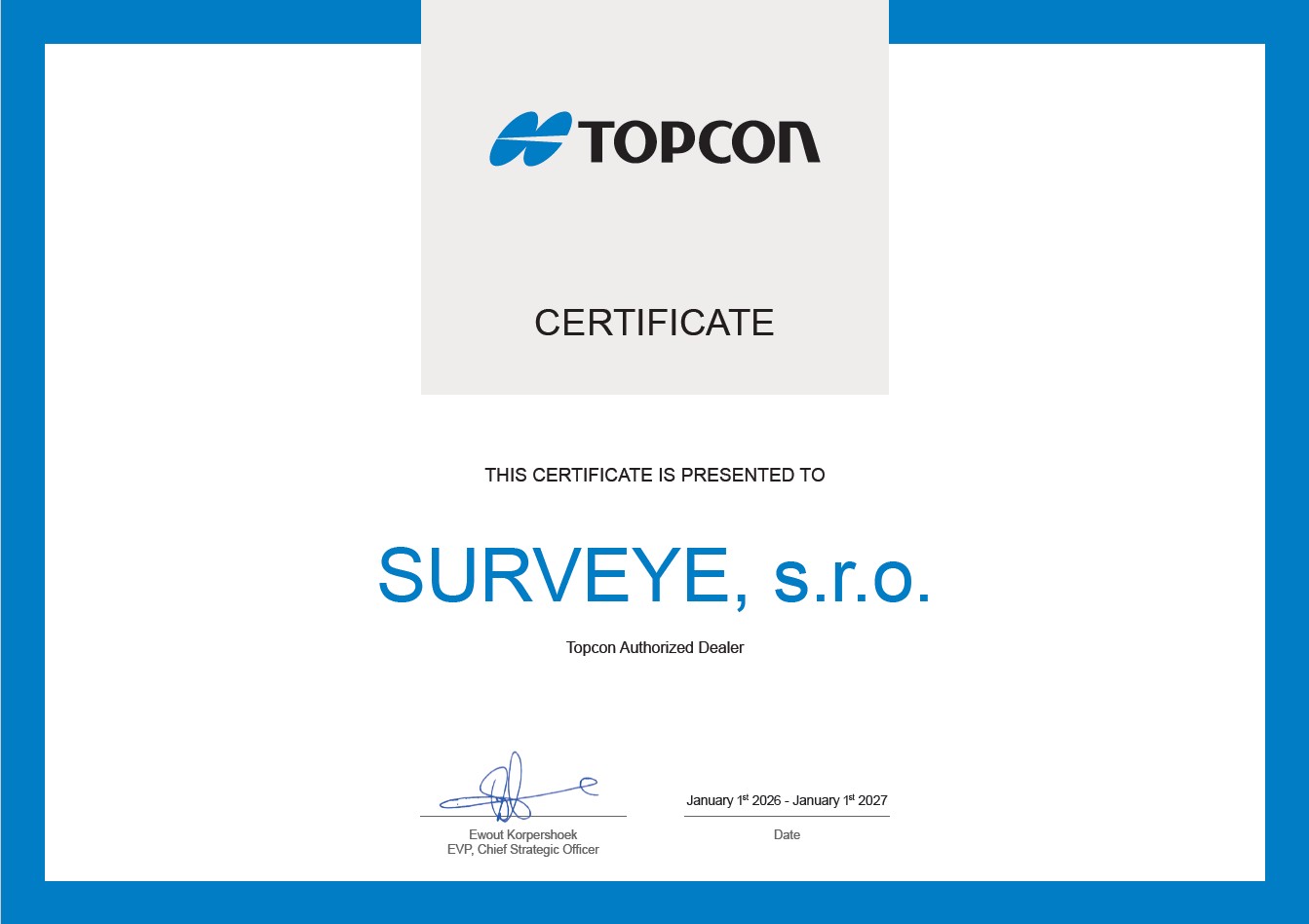 Spoločnosť SURVEYE, s.r.o. vznikla spoločenskou zmluvou 1.1.2014 a svoje sídlo má v Banskej Bystrici. Pokračuje v tradícií zastúpenia svetovej značky TOPCON na Slovensku ako autorizovaný distribútor. Okrem spomínanej značky spoločnosť distribuuje aj ďalšie svetové značky.