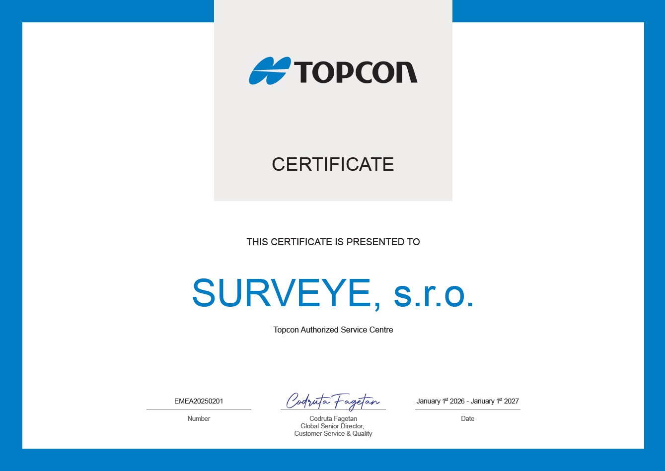 SURVEYE, s.r.o. je obchodnou spoločnosťou zaoberajúcou sa predajom geodetických a oftalmologických prístrojov TOPCON ako aj tvorbou geodát a služieb s tým súvisiacich. Poskytuje kompletné servisné a poradenské služby, technickú asistenciu, podporu a pomoc vo všetkých obchodných oddeleniach.